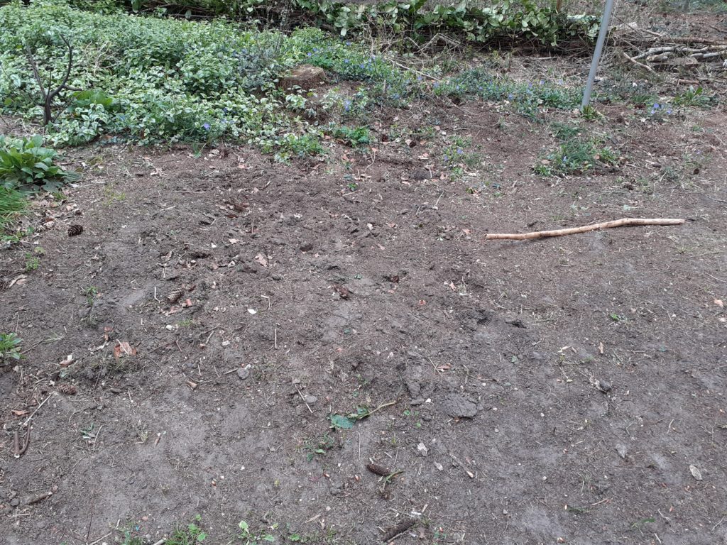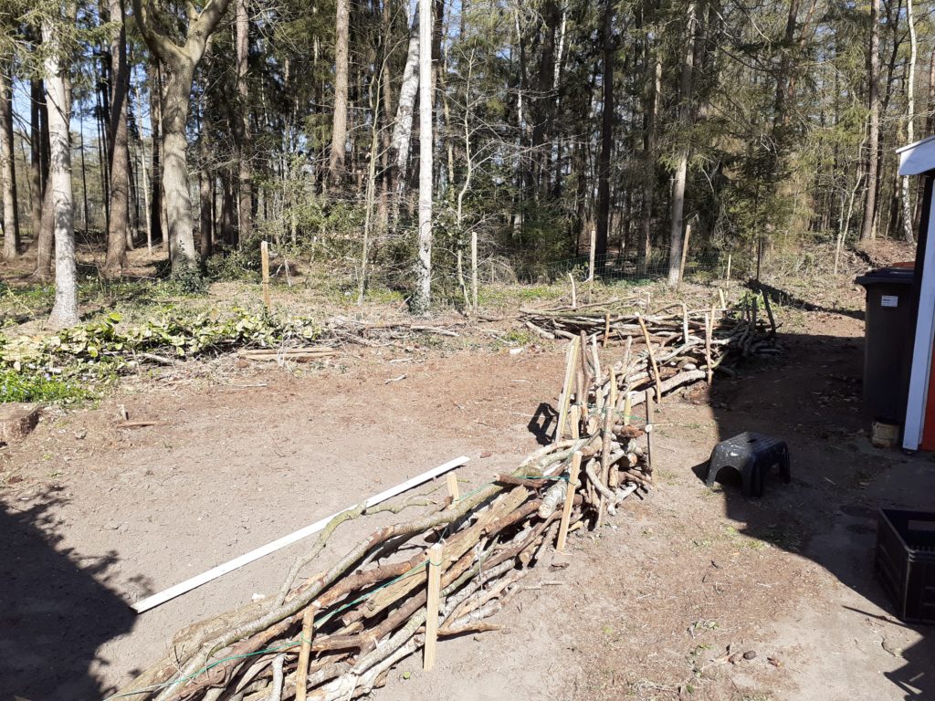 Vorige week en afgelopen weekend hard gewerkt aan de moestuin in oprichting. Een stuk tuin plant- en onkruidvrij gemaakt (de bodembedekkers heb ik herplant elders in de tuin). Hieromheen heb ik een hekje gemaakt van takken uit het bos en onze tuin. Provisorisch en low budget, maar het ziet er best leuk uit. Gewoon wat rechte takken/stokken om en om met een grondboor en een sleehamer in de grond meppen, hiertussen takken neerleggen. Wat verstevigd met een waslijn die ik nog had, en presto, de hond kan er niet meer in! Vanmorgen heb ik de aardappels gepoot, en deze weer bedekt met een laagje humus, opgeschept uit het bos. Ertussenin ‘paadjes’van houtsnippers, van de metershoge laag snoeihout die we nog hadden liggen van een jaar geleden en die we afgelopen zaterdag versnipperd hebben. Kortom, ‘make do with what you have’. Geen cent voor hoeven uitgeven (behalve dan aan wat compost, want die heb ik nog niet, een composthoop staat op de planning).