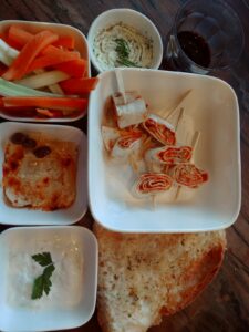 Je krijgt een doos vol met tapas, hapjes en mezze, in mooie schaaltjes, om lekker van te genieten: voor een feestelijk avondje thuis (of in de tuin). Het is (echt, dat hoor ik van iedereen) voldoende voor een maaltijd.