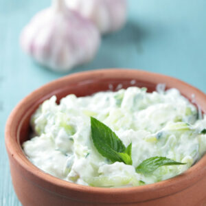 Heerlijk fris en zomers en ik waan me altijd gelijk in Griekenland als ik tzatziki eet. Het is een supereenvoudige maar ook superflexibele saus:  je kan het als dip eten op brood, het is lekker bij frietjes, als dressing in een salade, bij geroosterde groentes, in een sandwich, ga maar door. En geloof me, dit is zóóveel lekkerder zelfgemaakt, dan kant-en-klaar gekocht! Er hoort veel rauwe knoflook in, maar pas de hoeveelheid aan je eigen smaak aan.