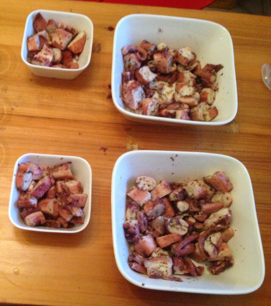 - Klop een marinade van de olijfolie, azijn, oregano en peper en zout en meng dit door de octopus.