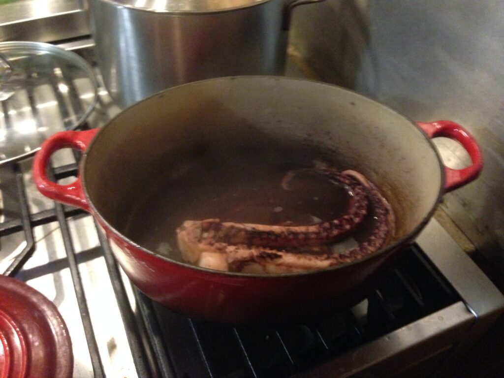- Leg de octopus in zijn geheel in een braadpan met dikke bodem, zonder enige toevoeging en doe het deksel erop. Zet het vuur zachtjes aan en laat de octopus in zijn eigen vocht gaar stoven. Je staat verbaast over de hoeveelheid water die er vanaf komt (en hoe de octopus slinkt!) Dit duurt circa een uur.