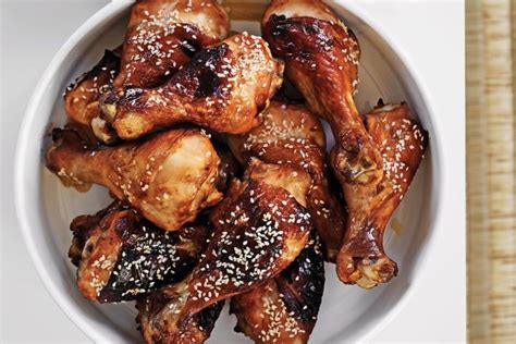 Biologische drumsticks in een marinade met ketjap en miso en vervolgens in de oven geroosterd en geglaceerd. Geserveerd met een knolselderij-aardappelgratin en een witlofsalade met mandarijntjes