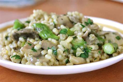 Risotto van parelgort met doperwtjes en groene aspergepuntjes € 13,50 vegetarisch