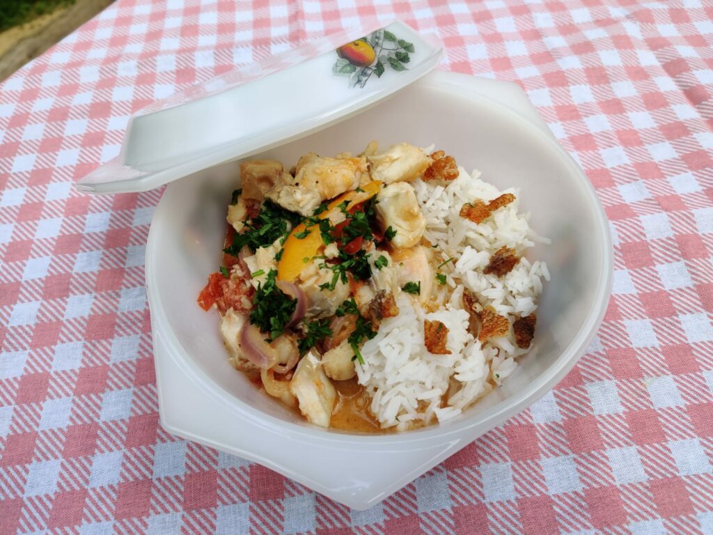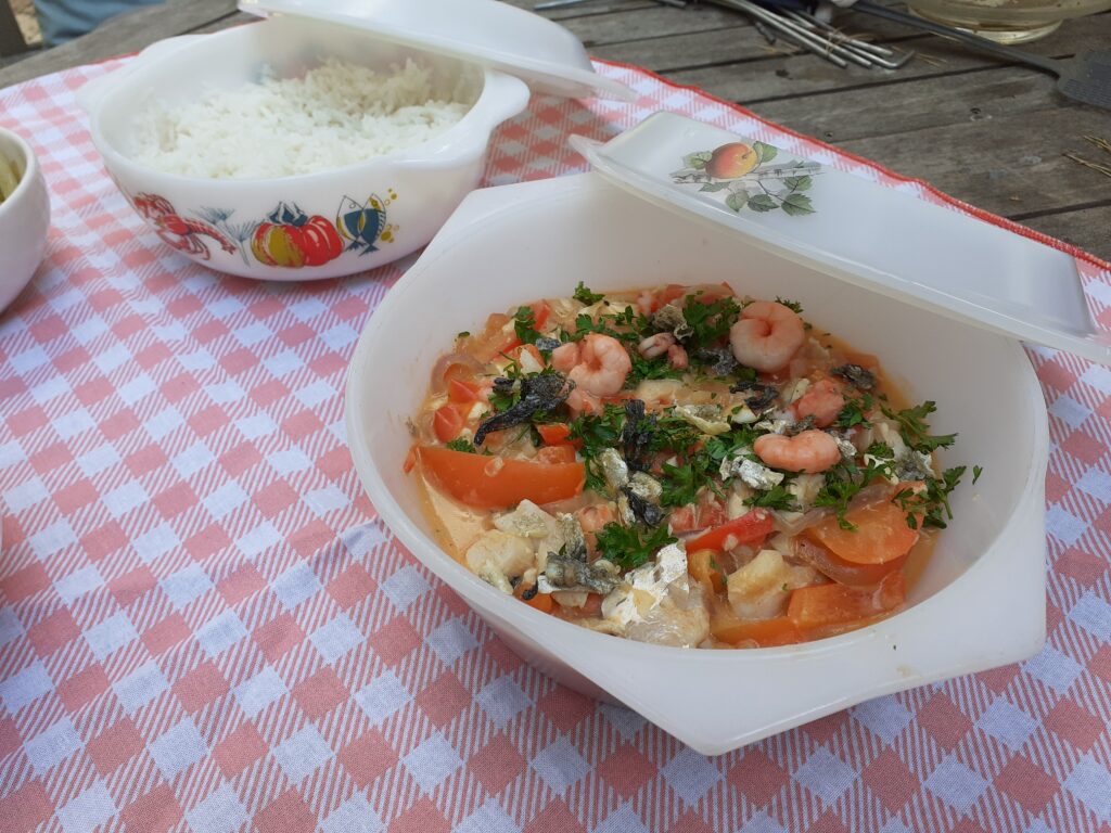 Een klassiek Braziliaans gerecht van tomaten, paprika’s en vis, gestoofd in kokosmelk. Eerst worden de groentes zachtjes gegaard in de kokosmelk, de vis wordt pas op het laatst toegevoegd en kort gestoofd, zodat deze botermals is. Gegarneerd met krokante stukjes geroosterde vissenhuid en peterselie (of koriander). Serveer met witte basmati rijst en wat komkommersalade.