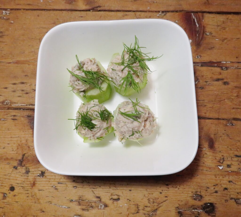 - Vul de komkommerbakjes met een lepeltje, of als je die hebt, met een kleine ijsschep waarmee je balletjes kan scheppen