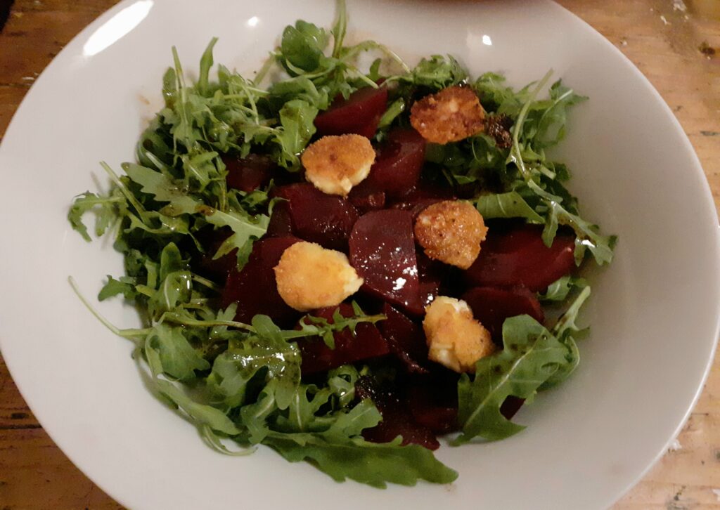 Salade van gepofte bietjes, rucola, geitenkaas en walnoten