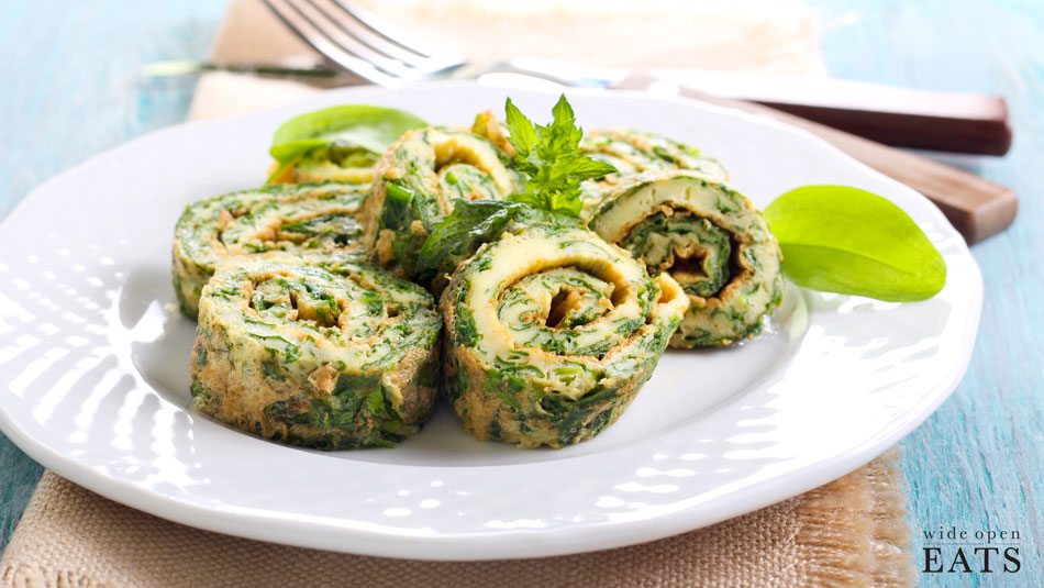 Omeletrolletjes met spinazie en zalm of (V) met spinazie en doperwt