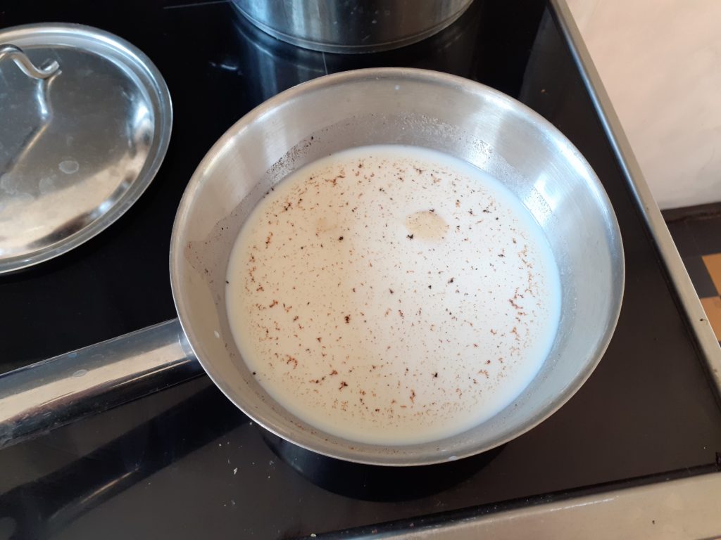 • Verwarm de melk, knoflook en nootmuskaat in een steelpannetje en laat 20 minuten zachtjes trekken. Zeef en bewaar de melk