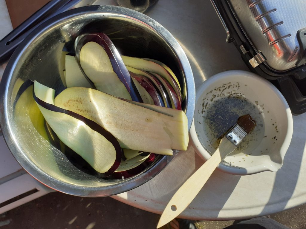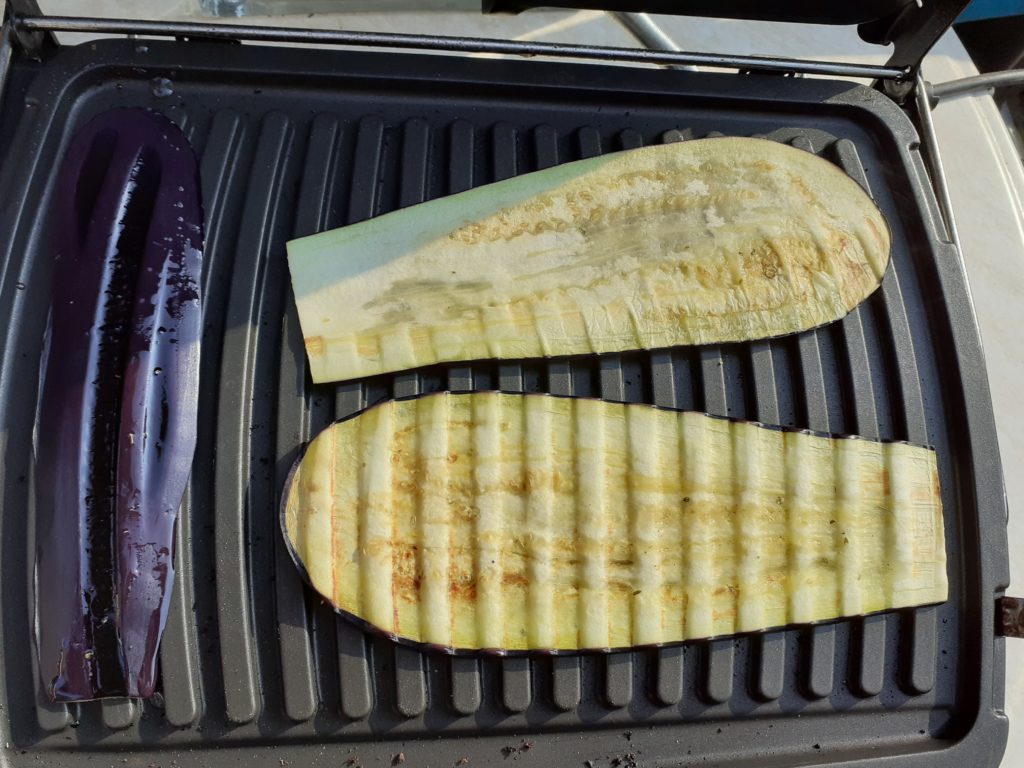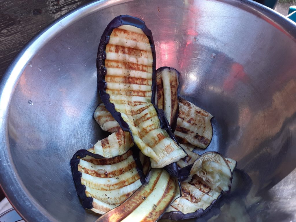 • Kwast elke plak aubergine in met olie en grill totdat ze bruine strepen hebben en gaar zijn.