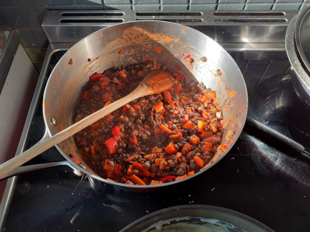 • Roer op het laatst de linzen er doorheen. Proef en voeg zout en peper naar smaak toe.