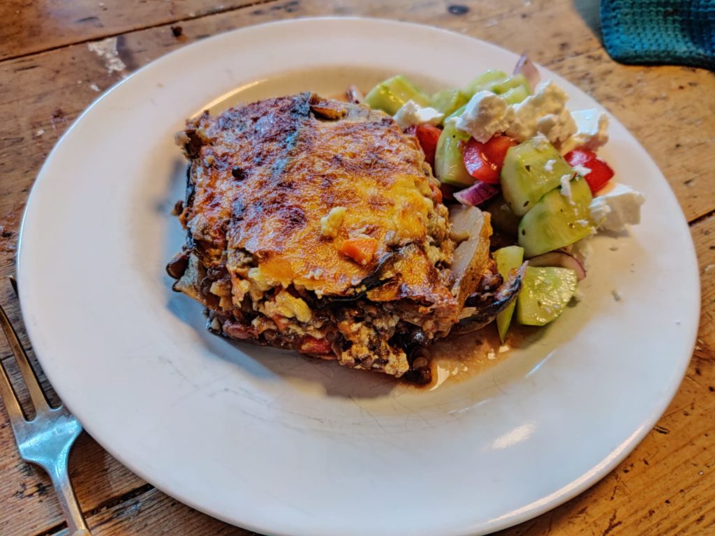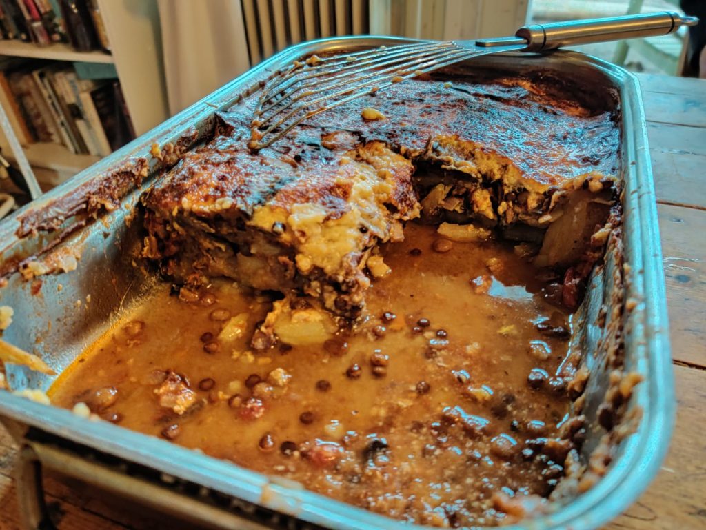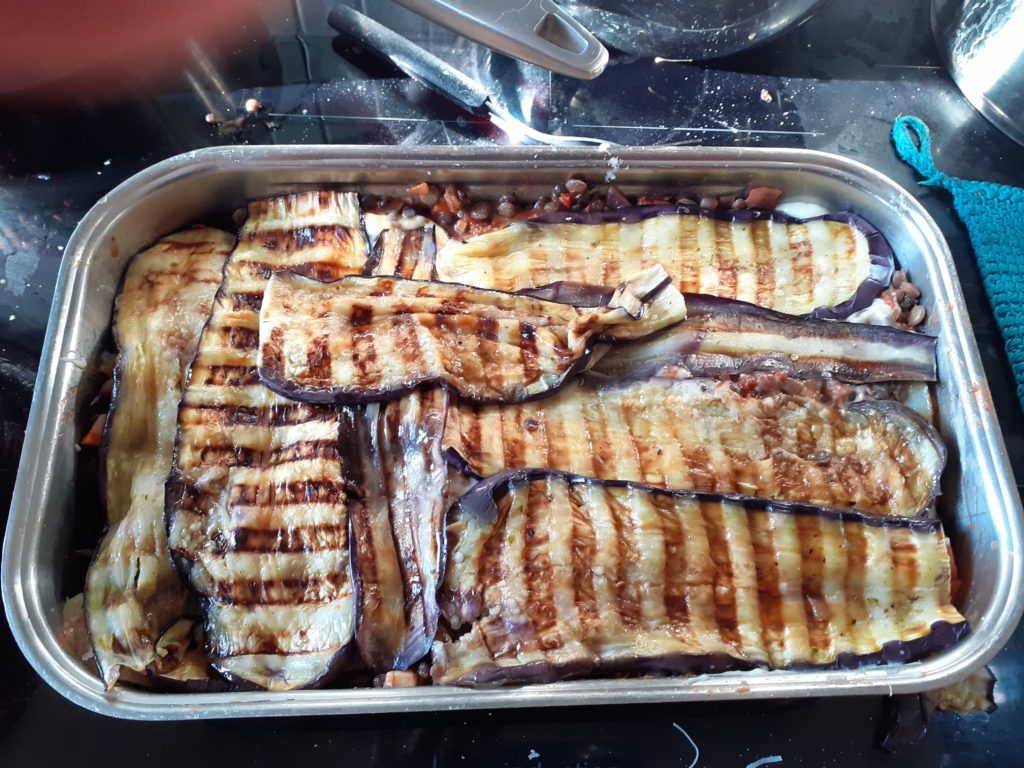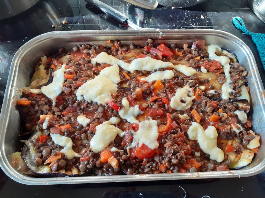 • Herhaal met nog een laag aardappels, aubergines, linzen, bechamel en kaas