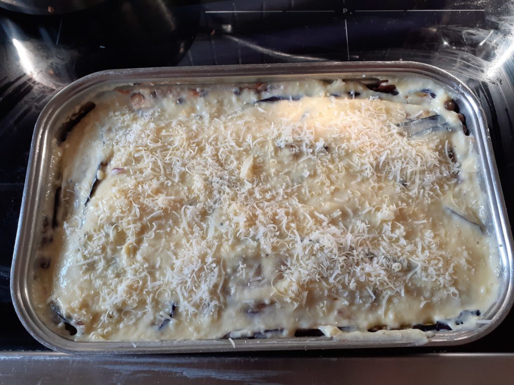 herhaal 1 tm 3 en eindig met een laag aubergines en bechamel en de laatste kaas